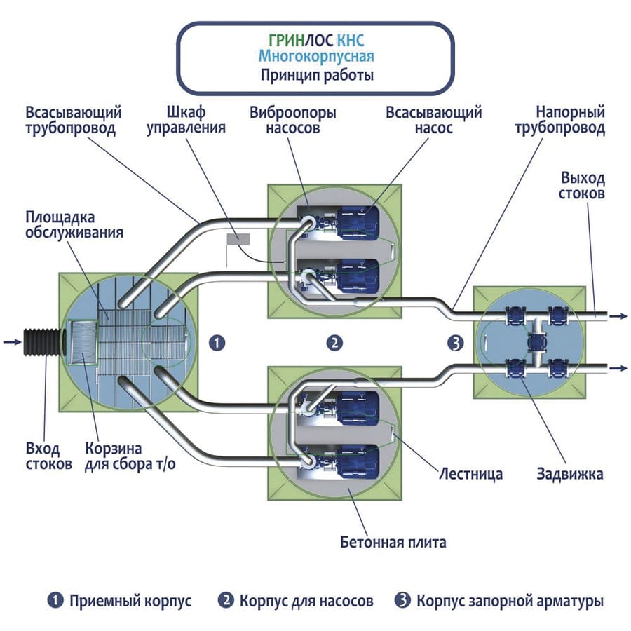 Многокорпусная Гринлос КНС состоит из нескольких корпусов: одного "мокрого" для накопления стоков и трёх "сухих" для размещения насосов и запорной арматуры. Система оснащена автоматическим управлением, надежной трубной арматурой и удобными элементами обслуживания.