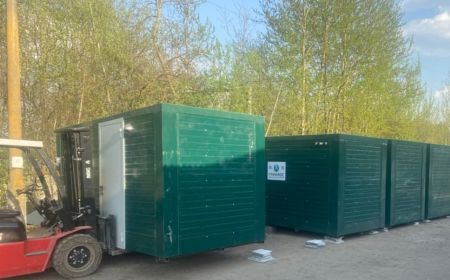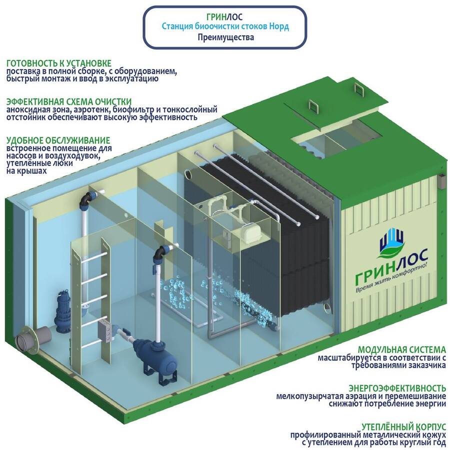 Станция представляет собой утепленный металлический контейнер, внутри которого установлен полипропиленовый модуль, разделенный на технологические отсеки: