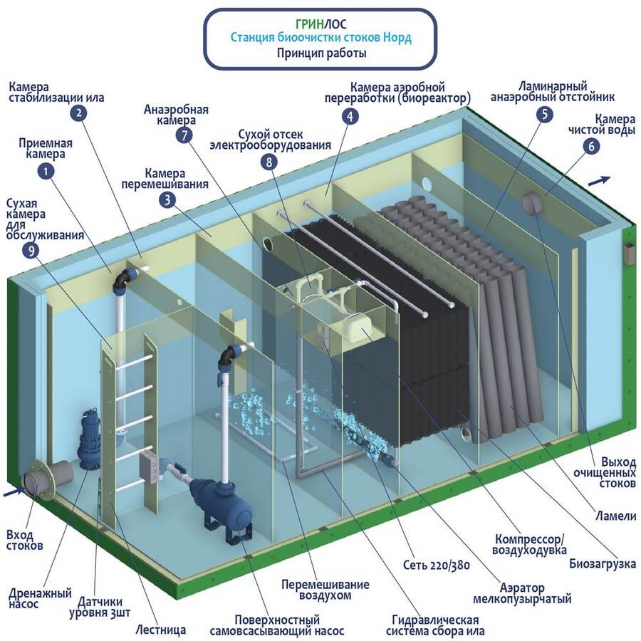 Станция работает на основе биологической очистки сточных вод с помощью активного ила. Для эффективной работы важно поддерживать благоприятные условия для микроорганизмов.