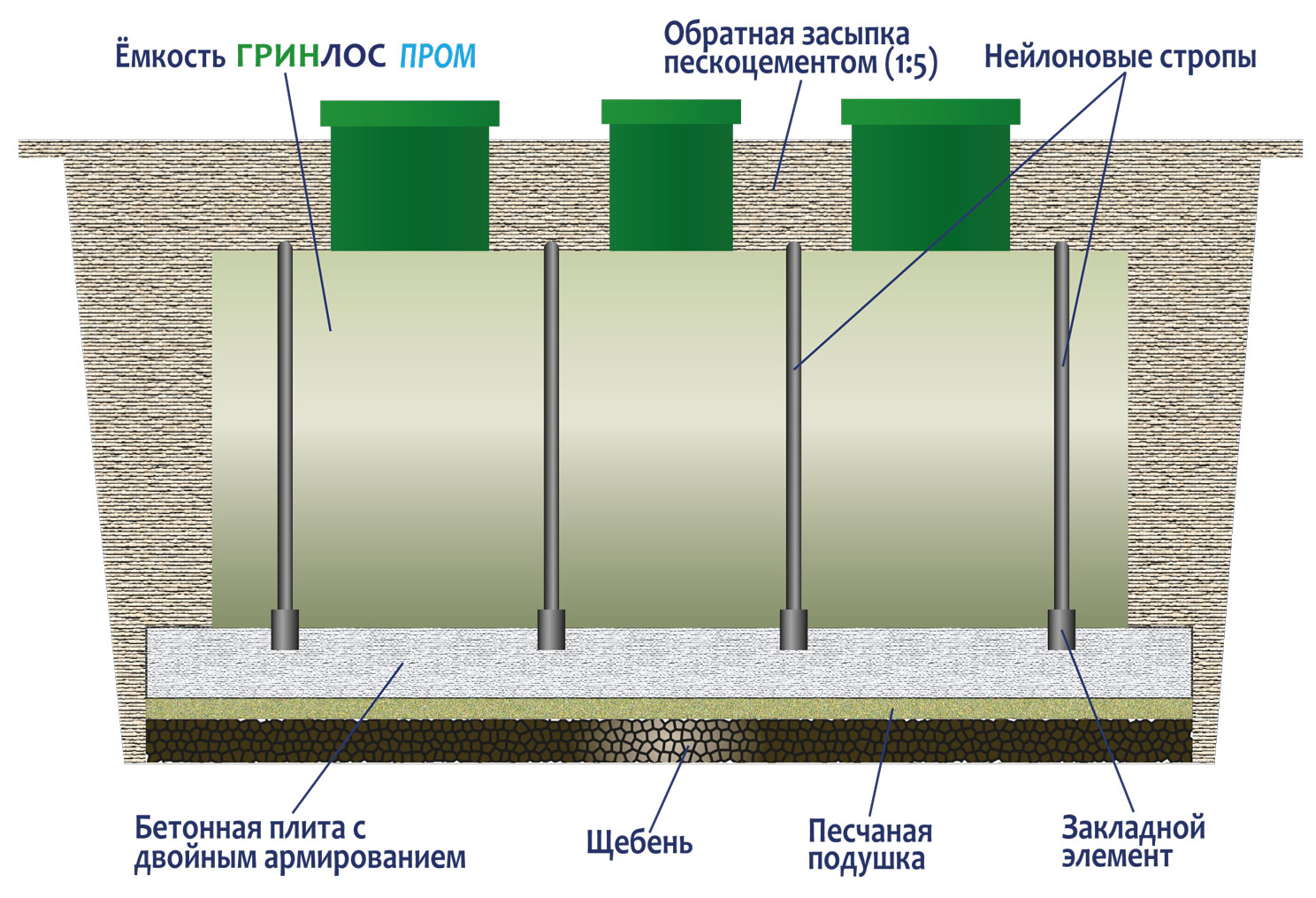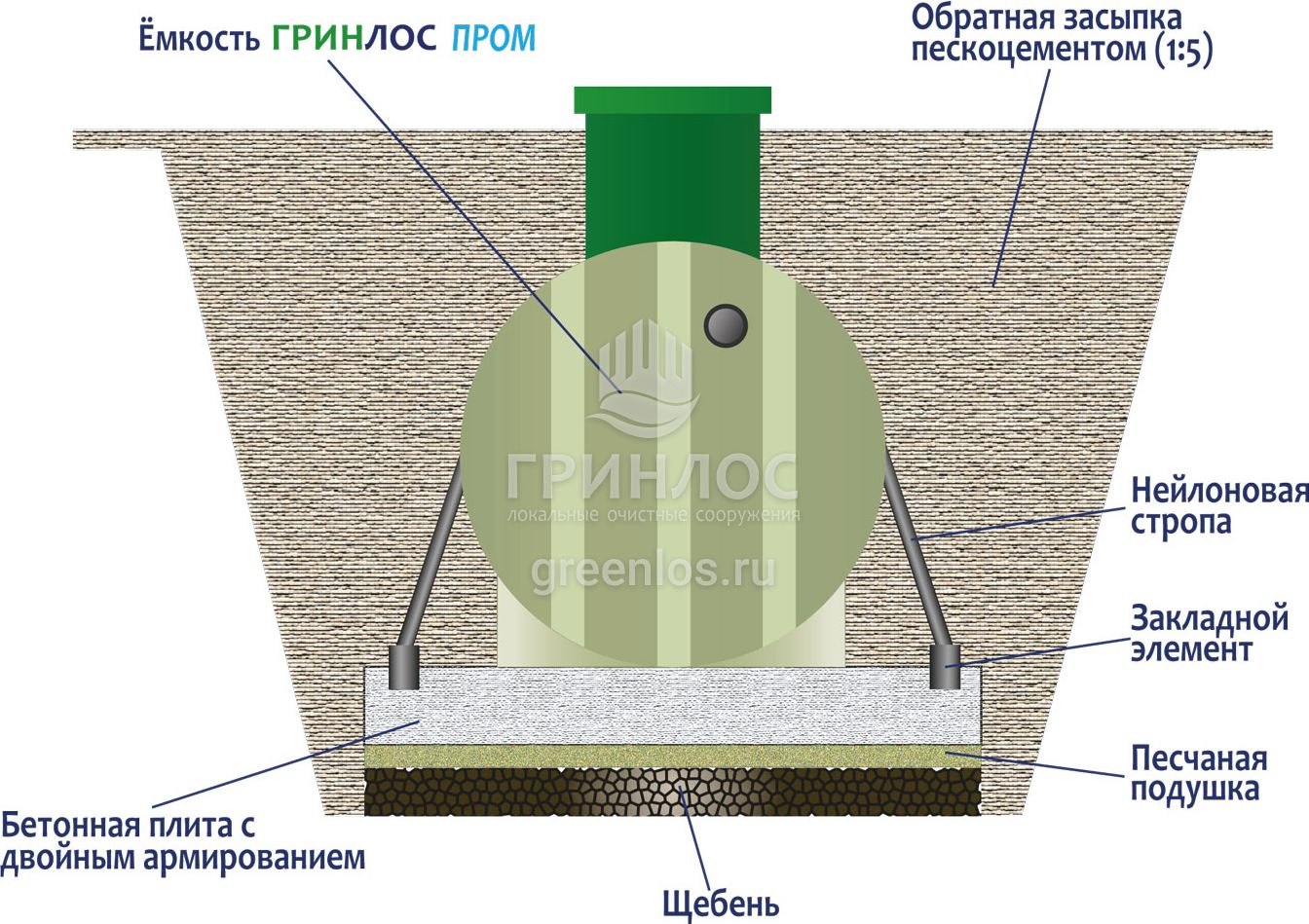 - Обратная засыпка (бетонирование). При заглублении септика на глубину не более 250 мм от верхнего пластикового горизонтального перекрытия до запланированного уровня земли, в однородных грунтах с низким уровнем вод обратную обсыпку допустимо производить песком смешанным с цементом (марка не ниже М500). Соотношение цемента и песка для обсыпки составляет 1:5. Песчано-цементная засыпка производится послойно, с обязательным трамбованием и проливкой водой каждого слоя. Толщина каждого слоя 300 мм. При условии уровня грунтовых вод выше 1500 мм от уровня земли, при наличии плывуна, скальных грунтов и прочих нестандартных ситуациях, а также в случае заглубления ГРИНЛОС Пром 200 более чем на 250 мм песчано-цементную смесь необходимо заменить бетоном. Одновременно с засыпкой септика он заполняется водой, уровень воды должен превышать уровень засыпки (бетонирования) не менее чем на 200 мм и не более чем на 500 мм.