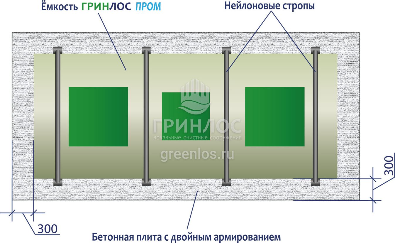 - Установка ГРИНЛОС Пром 200. Перед началом работ выполняется входной контроль качества, осмотр оборудования с целью обнаружения дефектов, полученных при транспортировке и хранении, с последующим подписанием акта передачи оборудования в монтаж. Так как станция имеет вес 1100 кг, установка производится монтажным краном, с помощью четырехветвевой стропы. Септик монтируется строго по уровню. После установки он фиксируется на плите синтетическими стропами за заранее подготовленные монтажные петли в плите.